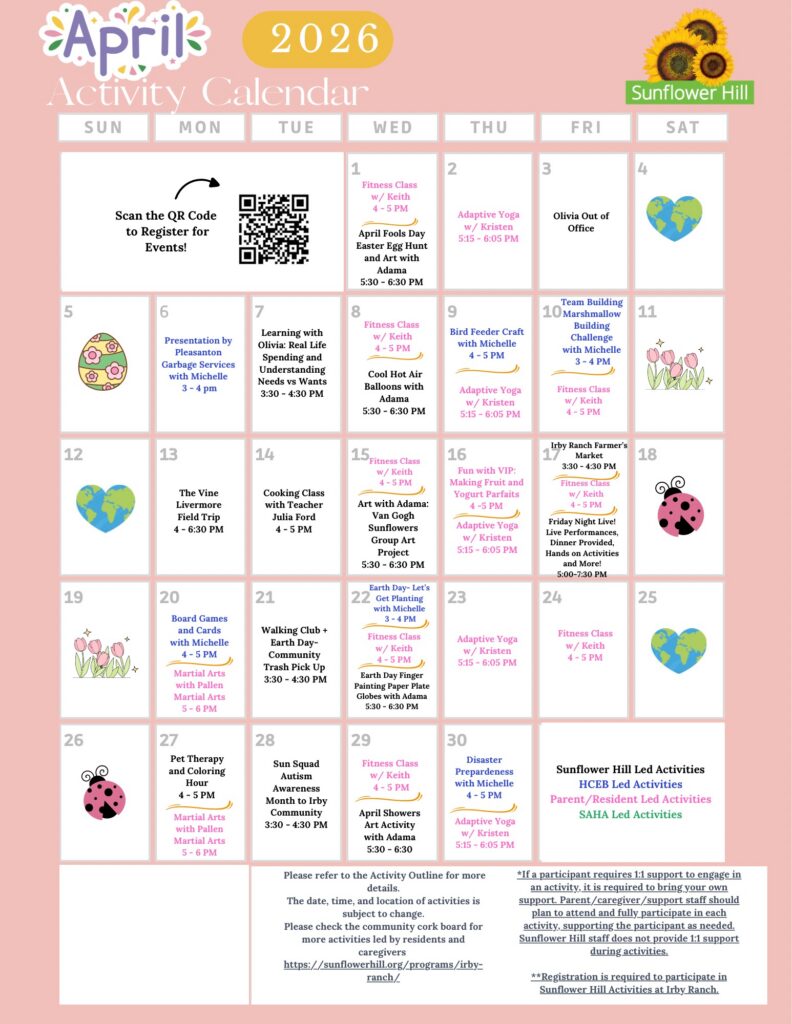 Sunflower Hill at Irby Ranch provides enrichment programming for our residents and the community at large. Are you interested in art? Physical fitness? Cooking? We offer these activities and more for people of all abilities. Limited spaces available – register today!
