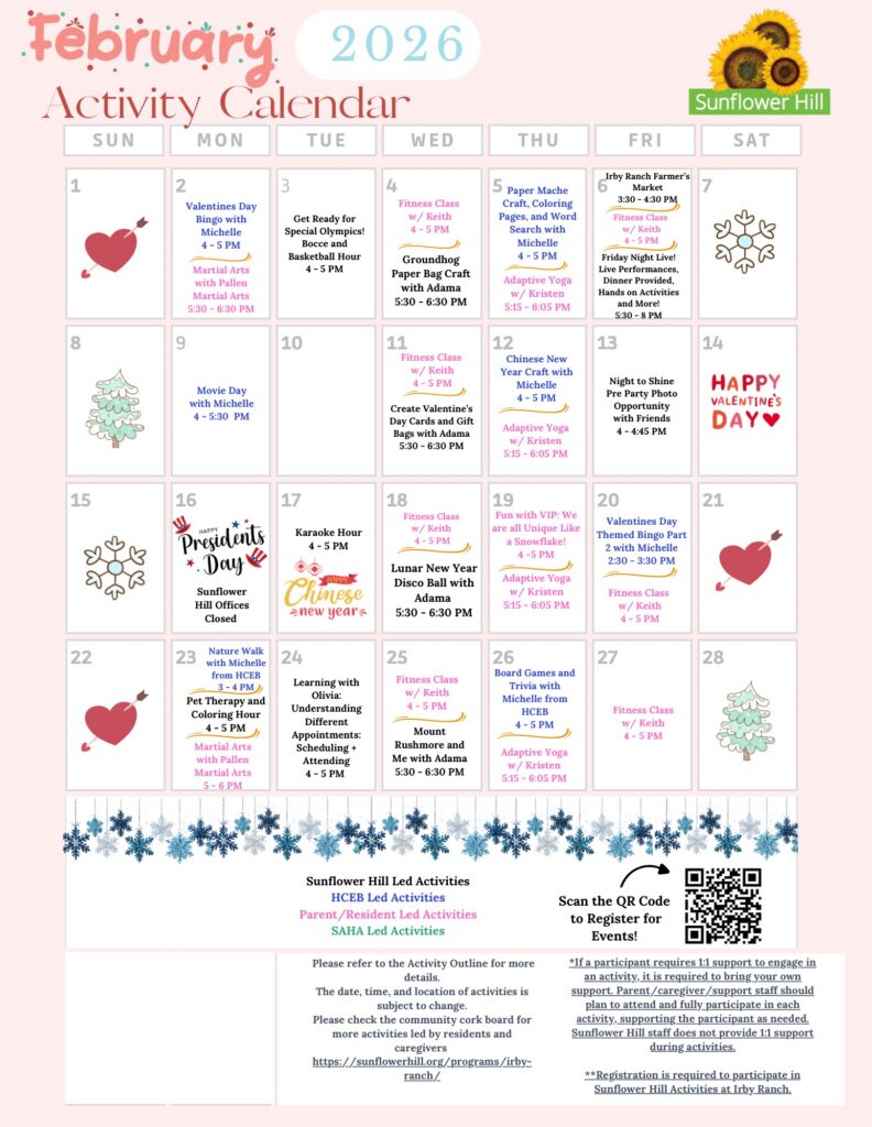 Join us one Friday a month for Friday Night Live at Irby Ranch! Enjoy a fun evening with dinner and engaging activities designed for adults with disabilities. Each month brings something new—whether it’s a performance, a guided activity, or another exciting experience. Don’t miss out on the fun!
